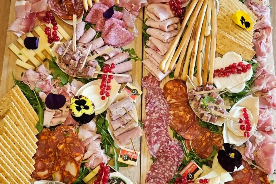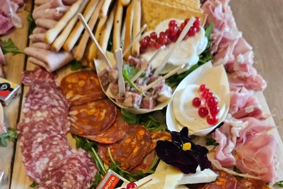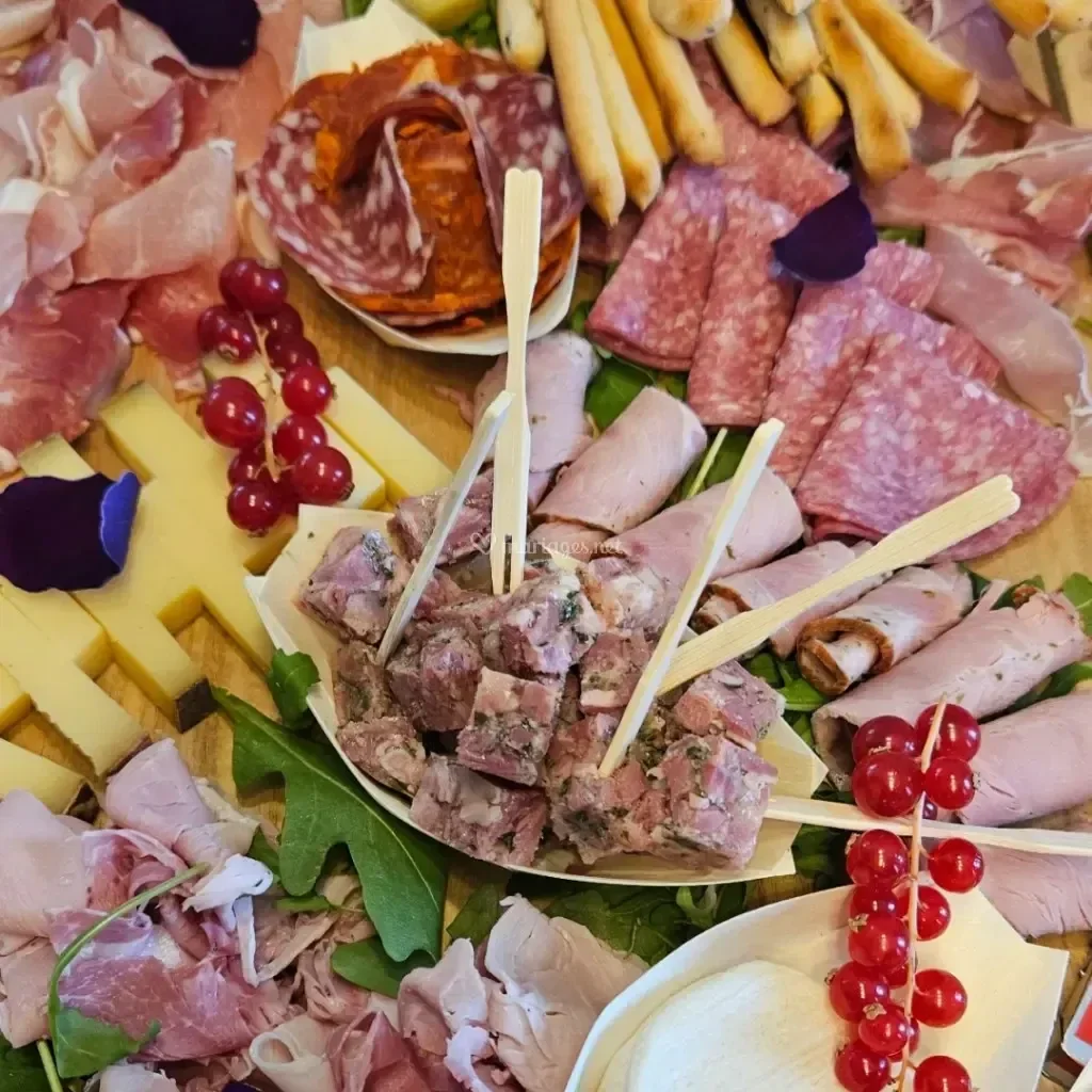 Planche de charcuterie locale et fromage frais accompagné de fruits legumes a croquer etc..