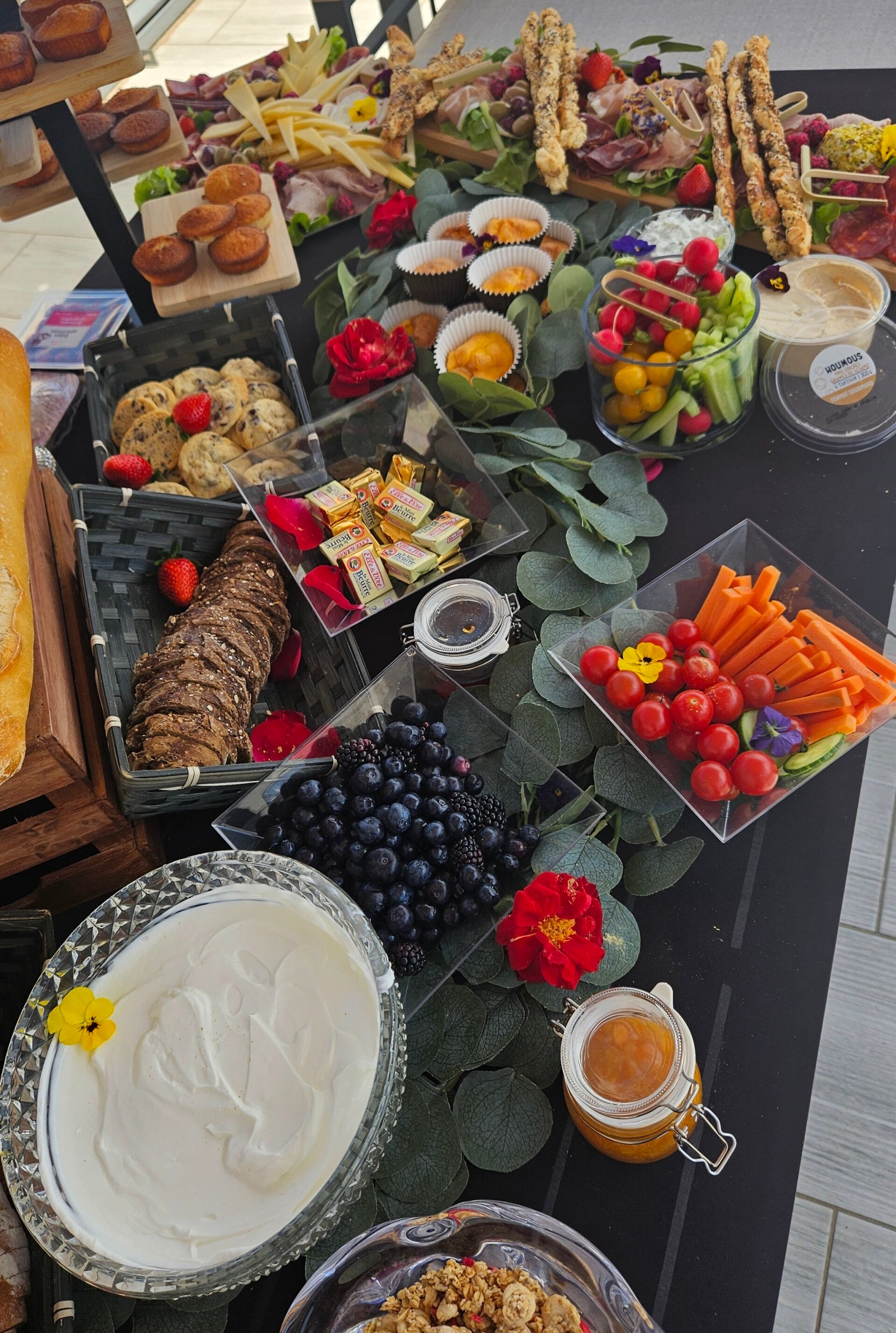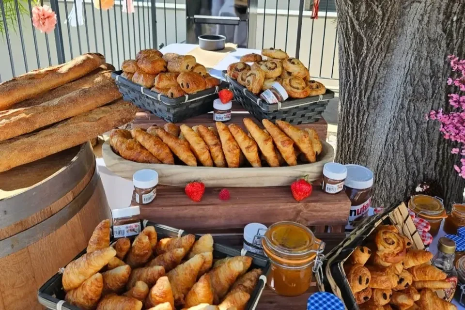 Mini quiche ,mini pizza, légumes à croquer , skyr muesli , pan cakes, mini viennoiserie choco, croissant, bitteroise, pain, financier cookies , brochettes de fruits , charcuterie, fromage 4 variété de chaque