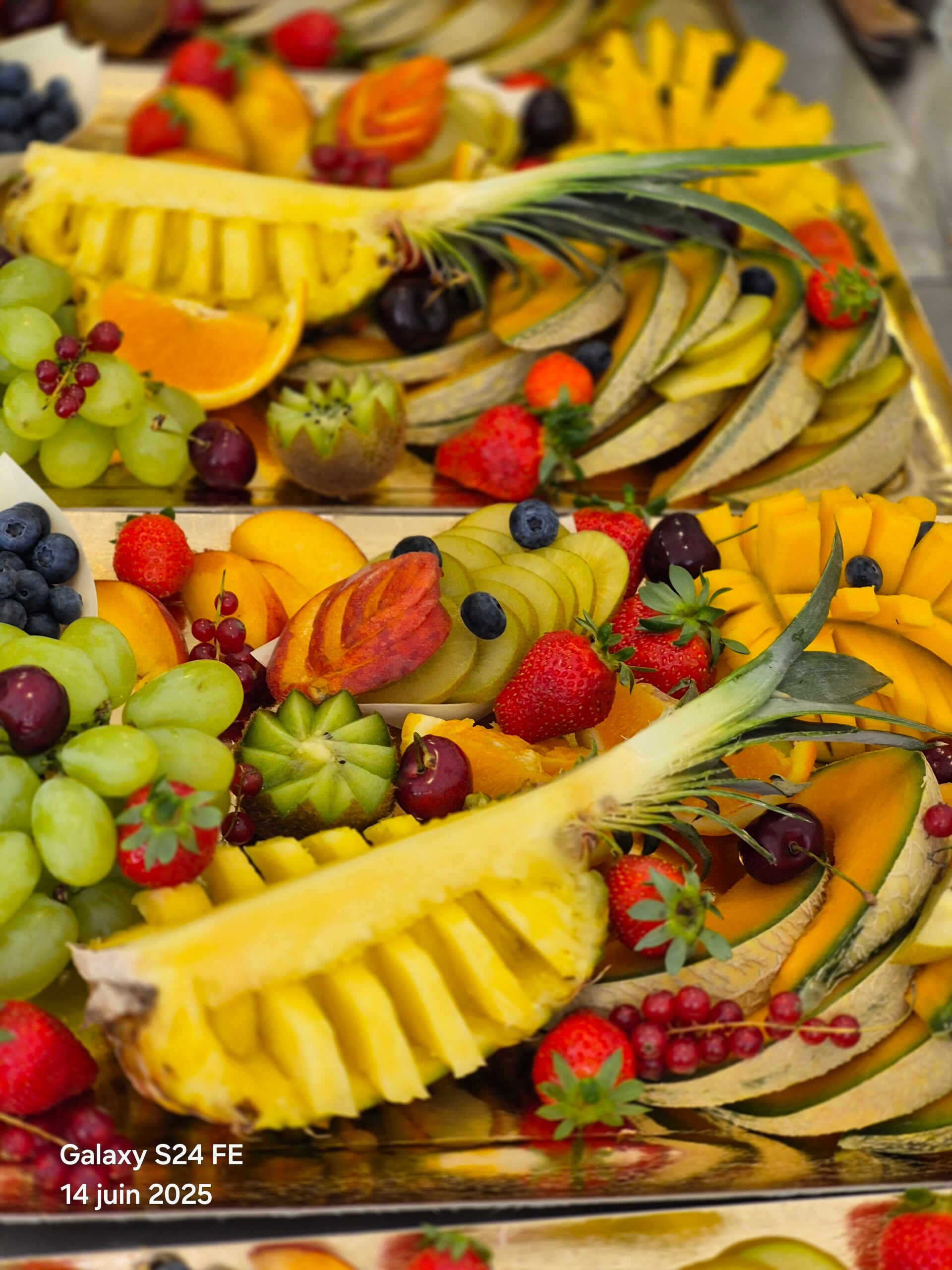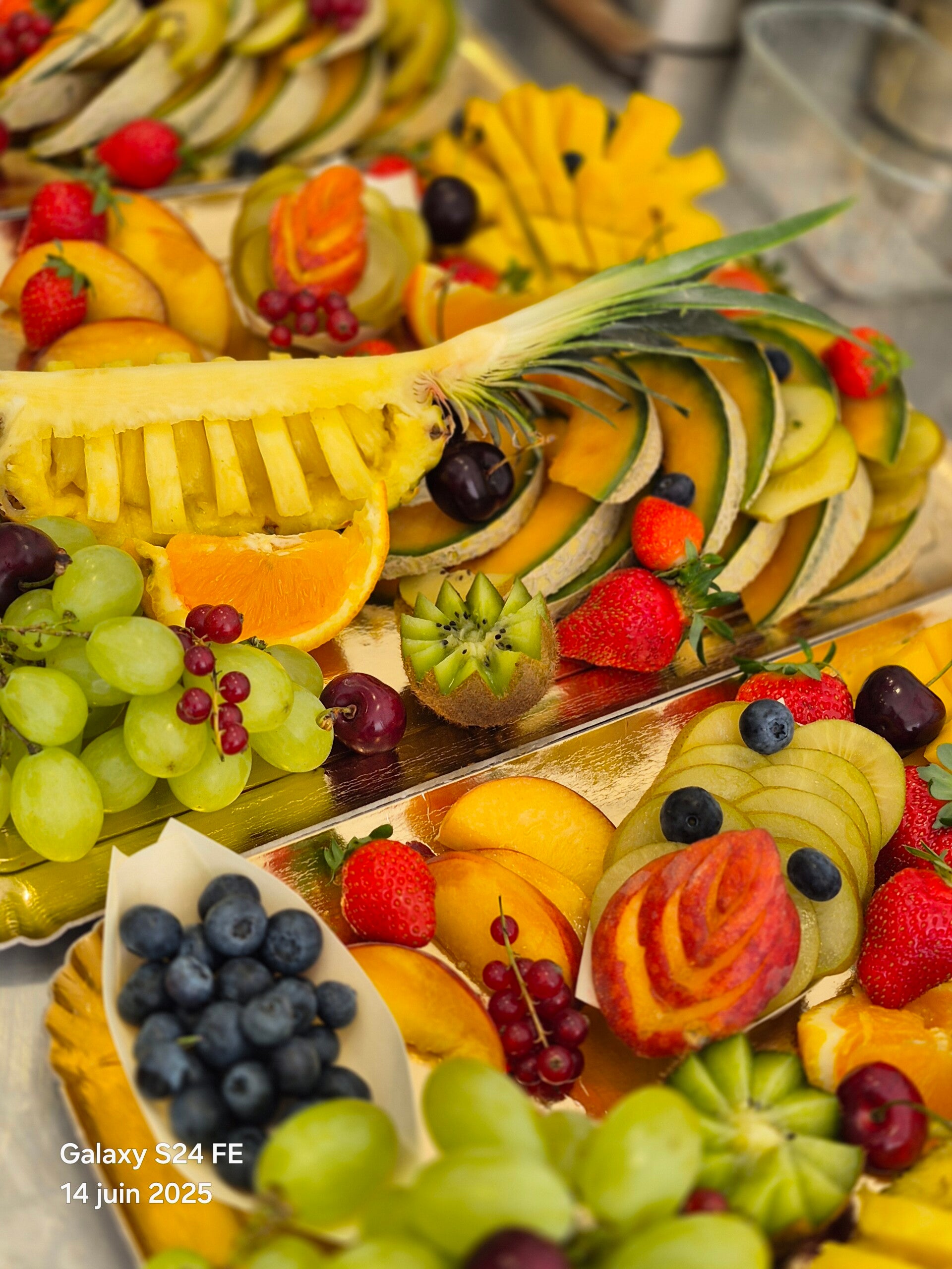 Un bouquet de fruits frais finement découpés : ananas, melon, kiwi, fraises, raisins… une présentation raffinée pour émerveiller vos invités et clôturer le repas en douceur. Idéal pour un buffet de mariage élégant et coloré. (varieté de fruits selon la saison)